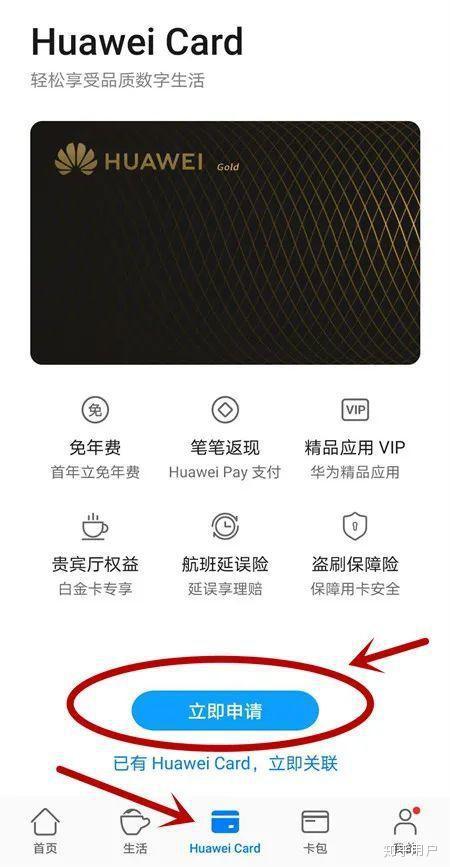 進入華為錢包APP,在底部正中央會出現“手機收購HUAWEI Card”的選單,進入後顯示“立即申請”,點選申請即可。